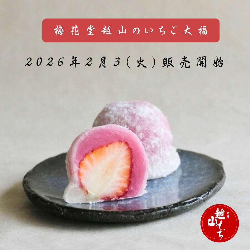 梅花堂越山自家製の【苺餡】と甘酸っぱい【佐賀ほのか】の苺を職人が手作業で包みました。当店の大人気商品です。